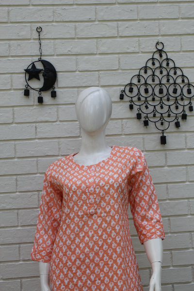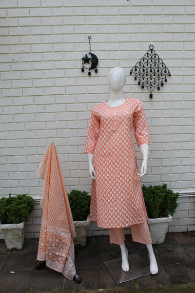 Step into effortless elegance with this cotton salwar suit featuring a charming all-over floral block print. The kurta comes in a straight-cut silhouette with three-quarter sleeves and a comfortable round neckline, perfect for everyday wear or casual gatherings. The matching cotton pants complement the kurta beautifully, creating a coordinated and graceful look.