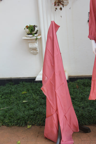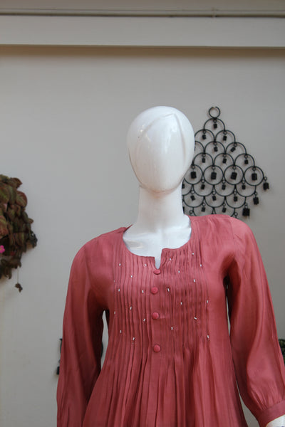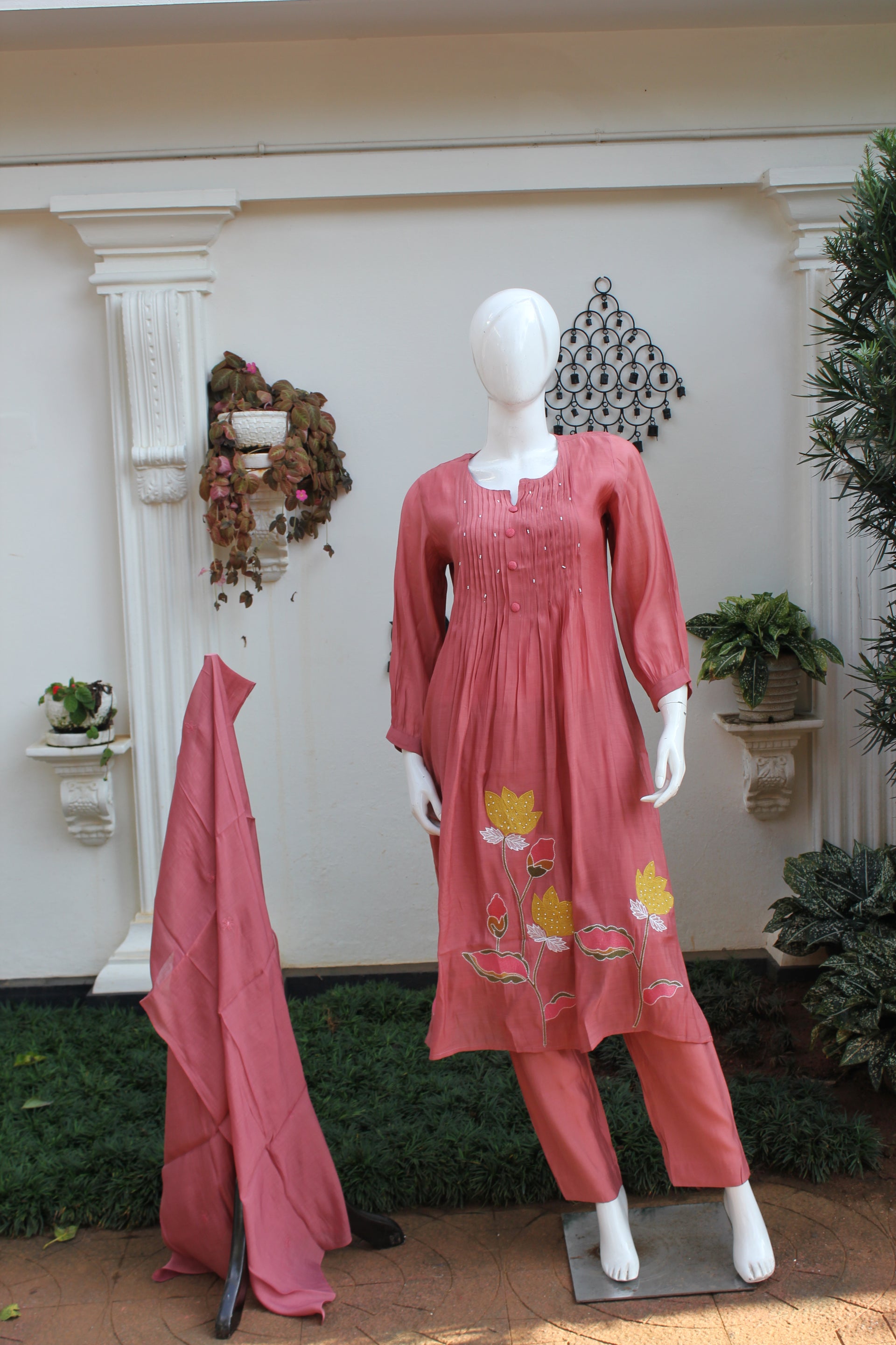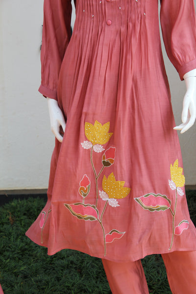 Add a touch of elegance to your wardrobe with this beautiful dusty rose three-piece set, designed with a perfect blend of comfort and style. The kurta features soft front pleats, delicate bead highlights, and handcrafted floral lotus embroidery near the hemline—giving it a graceful and artistic look.