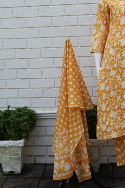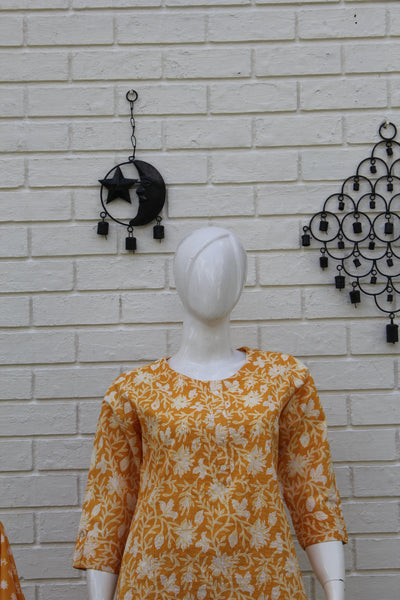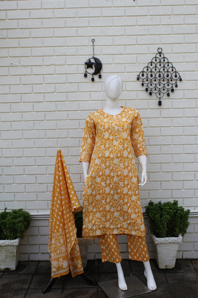 Step into effortless elegance with this yellow cotton salwar suit featuring a charming all-over floral block print. The kurta comes in a straight-cut silhouette with three-quarter sleeves and a comfortable round neckline, perfect for everyday wear or casual gatherings. The matching cotton pants complement the kurta beautifully, creating a coordinated and graceful look.
